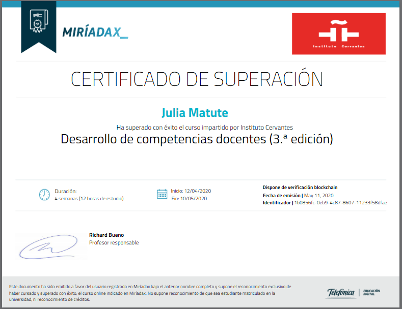 - Competencias Docentes online course from Instituto Cervantes sponsored by Miríadax online learning platform.