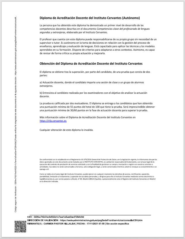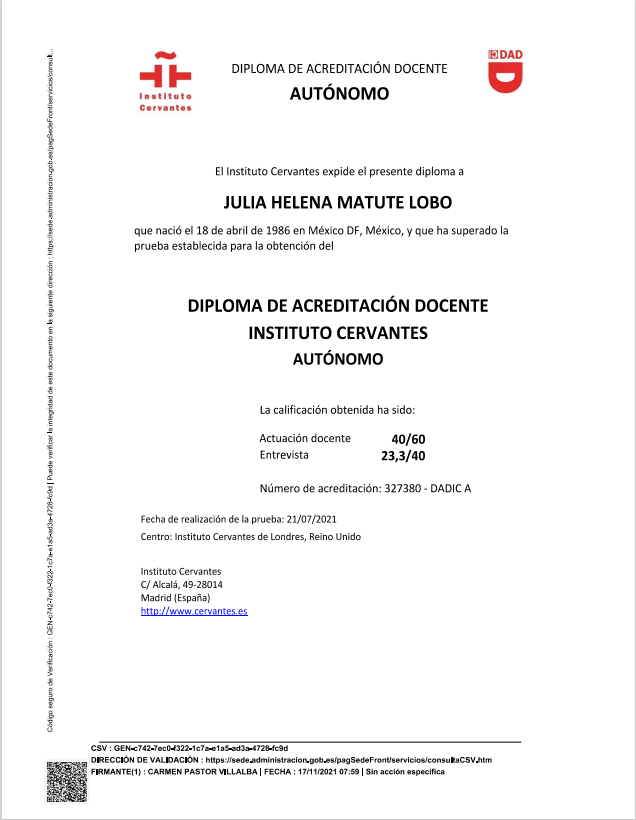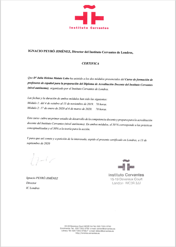 - Diploma of Teacher Accreditation (DADIC), course at Instituto Cervantes, London. Certificate of assistance attached and Dimploma attached.